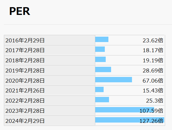 情報が1年前と古いですが、最高でも109.30倍、赤字公表前の値で127.26倍のため、かなりの不良株…